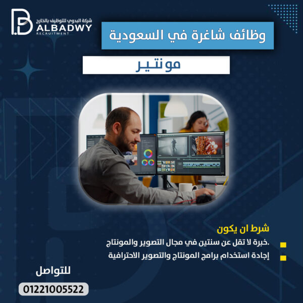 مونتير – للسعوديةAdmin2024-12-09مطلوب للعمل في شركة رائدة في تنظيم فعاليات المؤتمرات بالمملكة العربية السعودية 🔸 الوظيفة: مونتير ومصور 📍 ... اقرأ أكثر