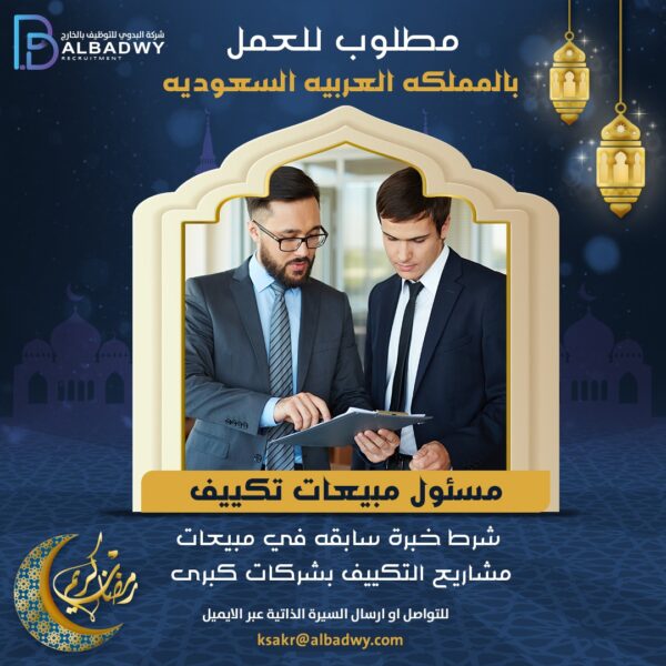 مسئول مبيعات تكييف – البدوي للتوظيف بالخارجBasem2023-03-18 مطلوب مسئول مبيعات تكييف للعمل بالمملكة العربية السعودية مطلوب مسؤل مبيعات مشاريع تكييف شرط خبرة سابقه في ... اقرأ أكثر