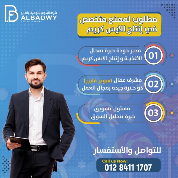 مطلوب (مدير جوده – مشرف عمال- مسئول تسويق) – البدوي للتوظيف بالخارجBasem2023-01-30مطلوب (مدير جوده – مشرف عمال- مسئول تسويق) للعمل بالسعودية -مدير جوده خبرة بمجال الاغذية وانتاج ... اقرأ أكثر