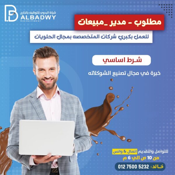 مطلوب (مدير مبيعات- مدير تسويق- اخصائي تسويق الكتروني- مندوبين مبيعات)- البدوي للتوظيف بالخارجBasem2023-02-01مدير مبيعات للعمل بكبري الشركات المتخصصه بمجال الحلويات شرط اساسي خبره بمجال تصنيع الشيكلاوته الوصف تخطيط ... اقرأ أكثر