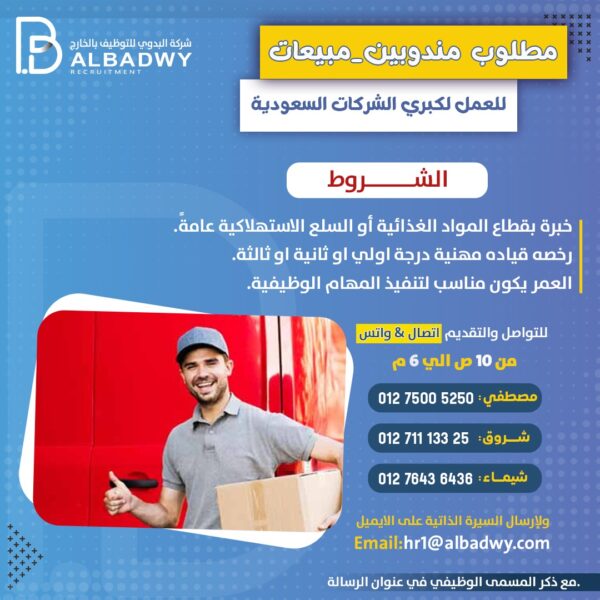 مطلوب مندوبين مبيعات – البدوي للتوظيف بالخارجBasem2023-01-30مندوبين مبيعات للعمل لدي كبري الشركات بالسعوديه الوصف تمثيل الشركات كمندوب لبيع السلع والخدمات، وتكوين علاقات ... اقرأ أكثر