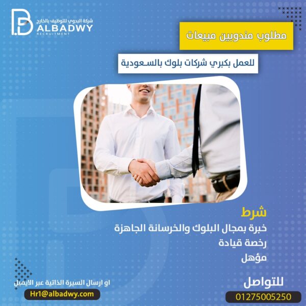 مندوب مبيعات – شركة البدوي للتوظيف بالخارجAdmin2023-06-18مطلوب للعمل بالمملكة العربية السعودية مندوب مبيعات الشروط :- خبره بمجال البلوك والخرسانه الجاهزه رخصه قياده مؤهل ... اقرأ أكثر