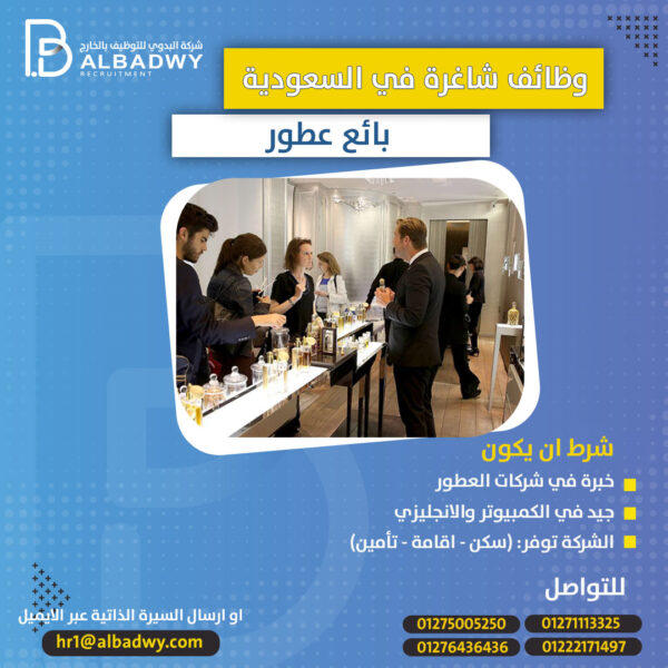 بائع عطور – شركة البدوي للتوظيف بالخارجAdmin2023-11-07وظائف شاغرة في السعودية بائع عطور شرط: • خبرة في شركات العطور • جيد في الانجليزي والكمبيوتر ... اقرأ أكثر