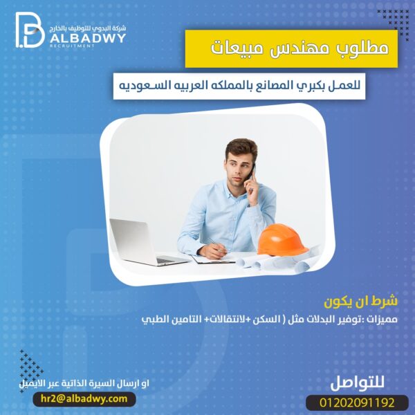 مهندس مبيعات – شركة البدوي للتوظيف بالخارجAdmin2023-05-31مطلوب للعمل بالمملكة العربية السعودية مهندس مبيعات الشروط :- خبره في العمل ك مهندس مبيعات المهام الوظيفية ... اقرأ أكثر