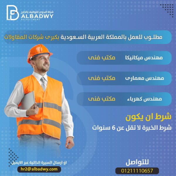مراقب معماري – مراقب ميكانيكا – مراقب كهرباء – مدير مستودع – شركة البدوي للتوظيف بالخارجAdmin2023-06-18مطلوب للعمل بشركة مقاولات بالمملكة العربية السعودية 1- مراقب معماري 2- مراقب ميكانيكا 3- مراقب كهرباء 4- ... اقرأ أكثر