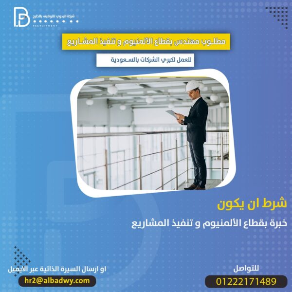مهندس بقطاع الالمنيوم وتنفيذ المشاريع – شركة البدوي للتوظيف بالخارجAdmin2023-05-16مطلوب للعمل بكبري الشركات بالمملكة العربية السعودية مهندس بقطاع الالمنيوم وتنفيذ المشاريع الشروط:- ان يكون خبره بقطاع ... اقرأ أكثر