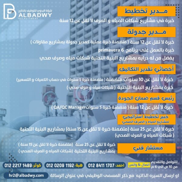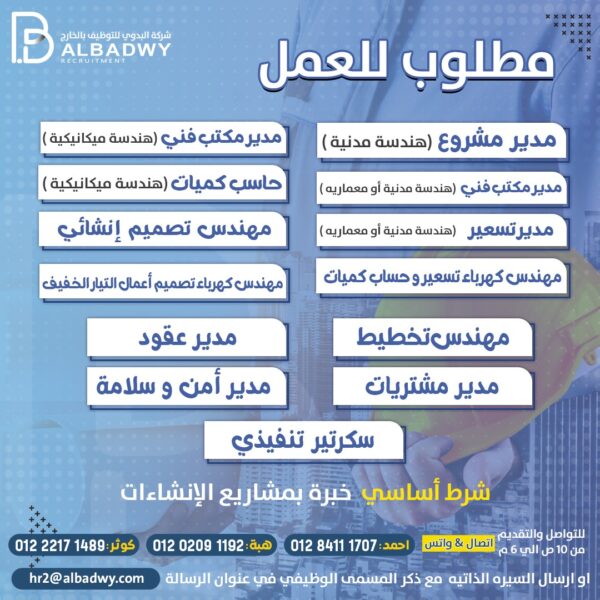 مطلوب وظائف هندسية – البدوي للتوظيف بالخارجBasem2023-02-06مطلوب للعمل بالمملكة العربية السعودية مدير مشروع خبرة لا تقل عن 20 عام بمشاريع الإنشاءات مدير ... اقرأ أكثر