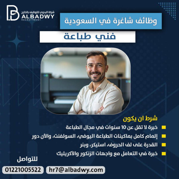 فني طباعة – للسعوديةAdmin2025-02-13فرصة عمل مميزة في مجال الجرافيك والدعاية والإعلان – القصيم، السعودية إذا كنت فني طباعة ذو خبرة ... Read more
