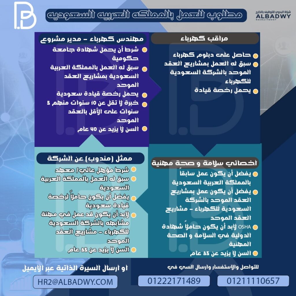 مراقب كهرباء -مهندس كهرباء/ مدير مشروع -اخصائي سلامة وصحة مهنيه – مندوب عن الشركة
